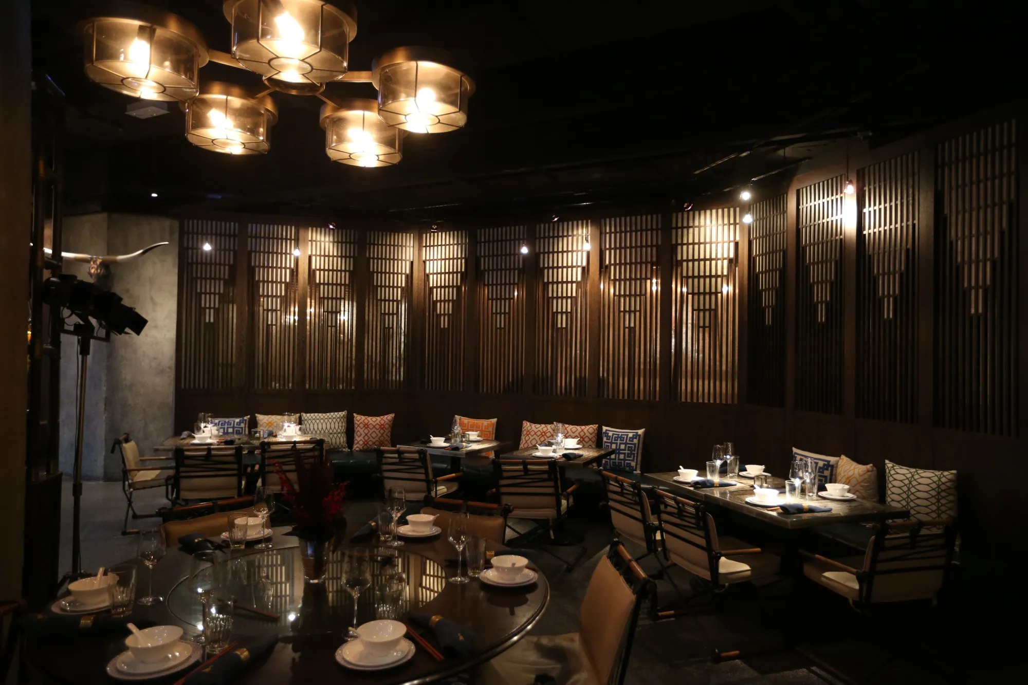 **適合商務會談嗎?**可以,只要不涉及需要在昏暗光線下閲讀的書面材料。桌間距足夠進行會議,儘管空間開闊,但室內設計巧妙分區營造出温馨感。另有五間私密及半私密包間可供選擇。