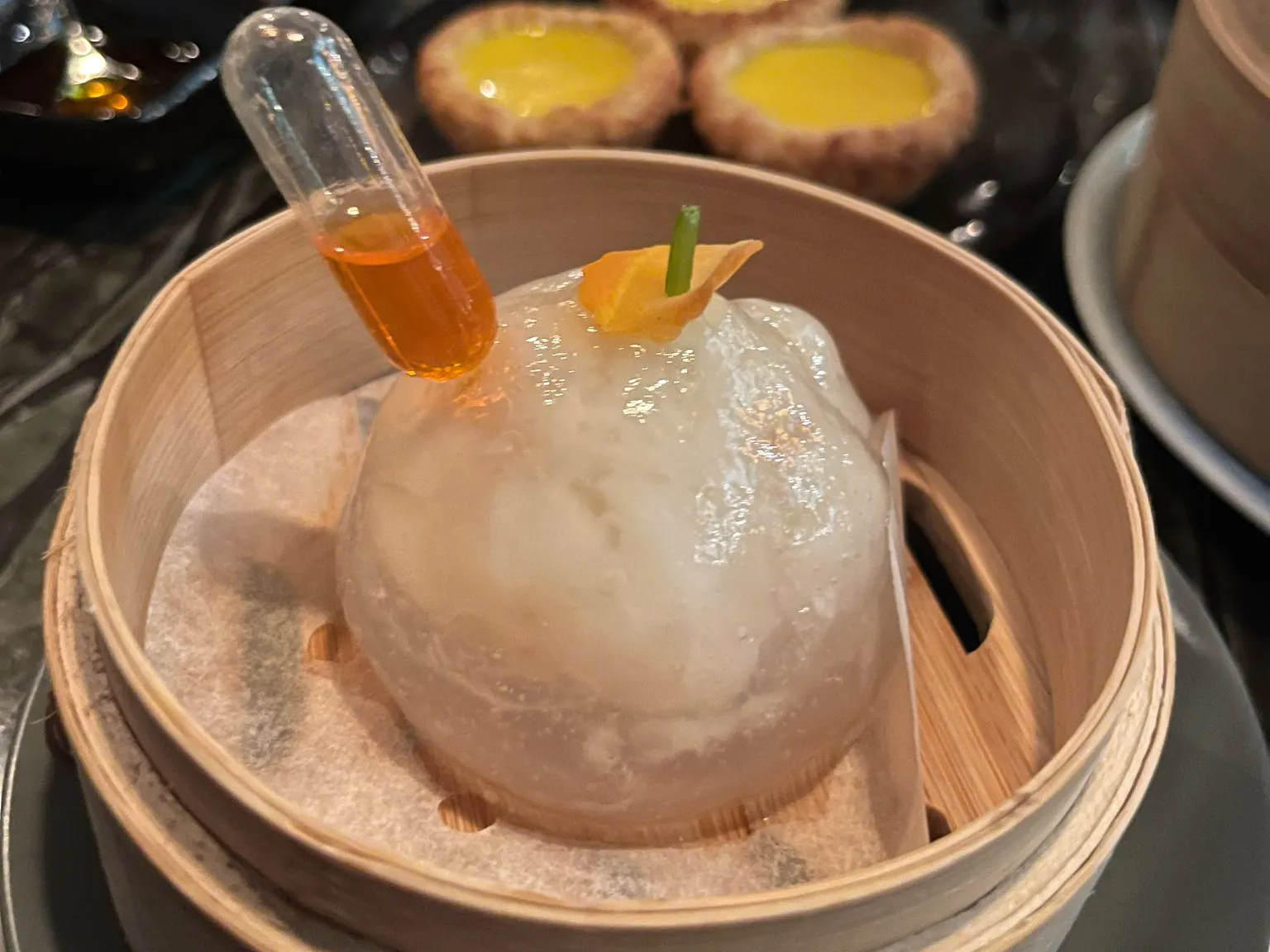 配辣椒油注射器的龍蝦雲南火腿蝦餃。攝影師:*Katia Dmitrieva/*彭博社我們會再次點的菜品: 每一樣。每道點心都呈現出相當獨特的風格。尤其突出的是海鮮蔬菜餃,將鮮美的扇貝和蝦仁完美融合在一口大小的餃子裏——當然還點綴了魚子醬。蛋撻(78港幣)現烤現賣,外皮酥脆,內餡是略帶甜味的蛋香美味。