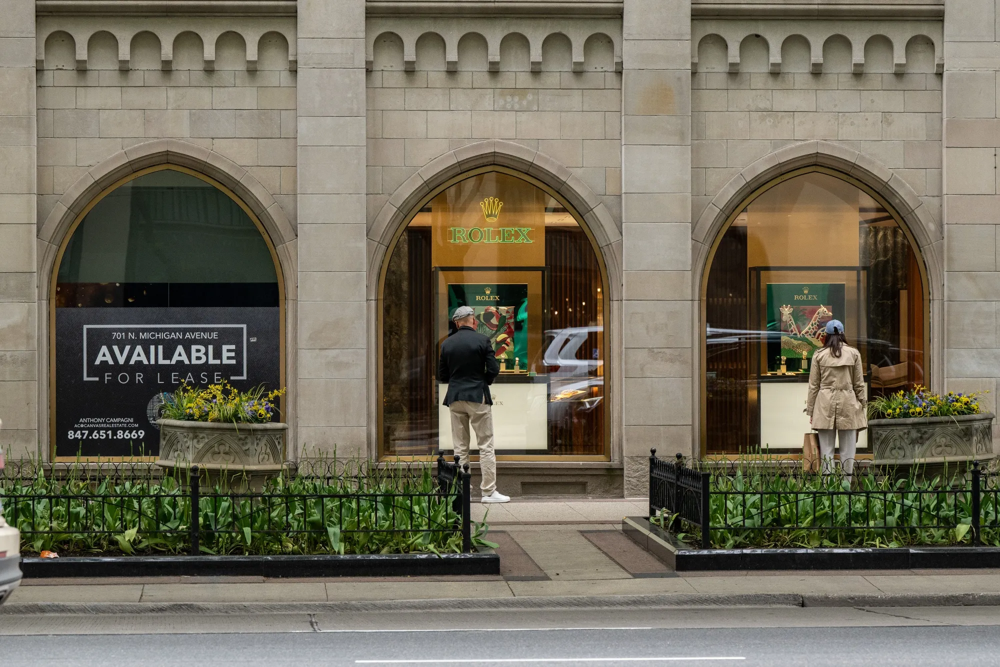 美國伊利諾伊州芝加哥的一家勞力士門店。攝影師:Christopher Dilts/彭博社瑞士手錶出口在5月份下降了近10%,主要由於對美國的出貨量大幅下滑,逆轉了上月的激增態勢——當時製造商正試圖提前應對即將到來的貿易戰。