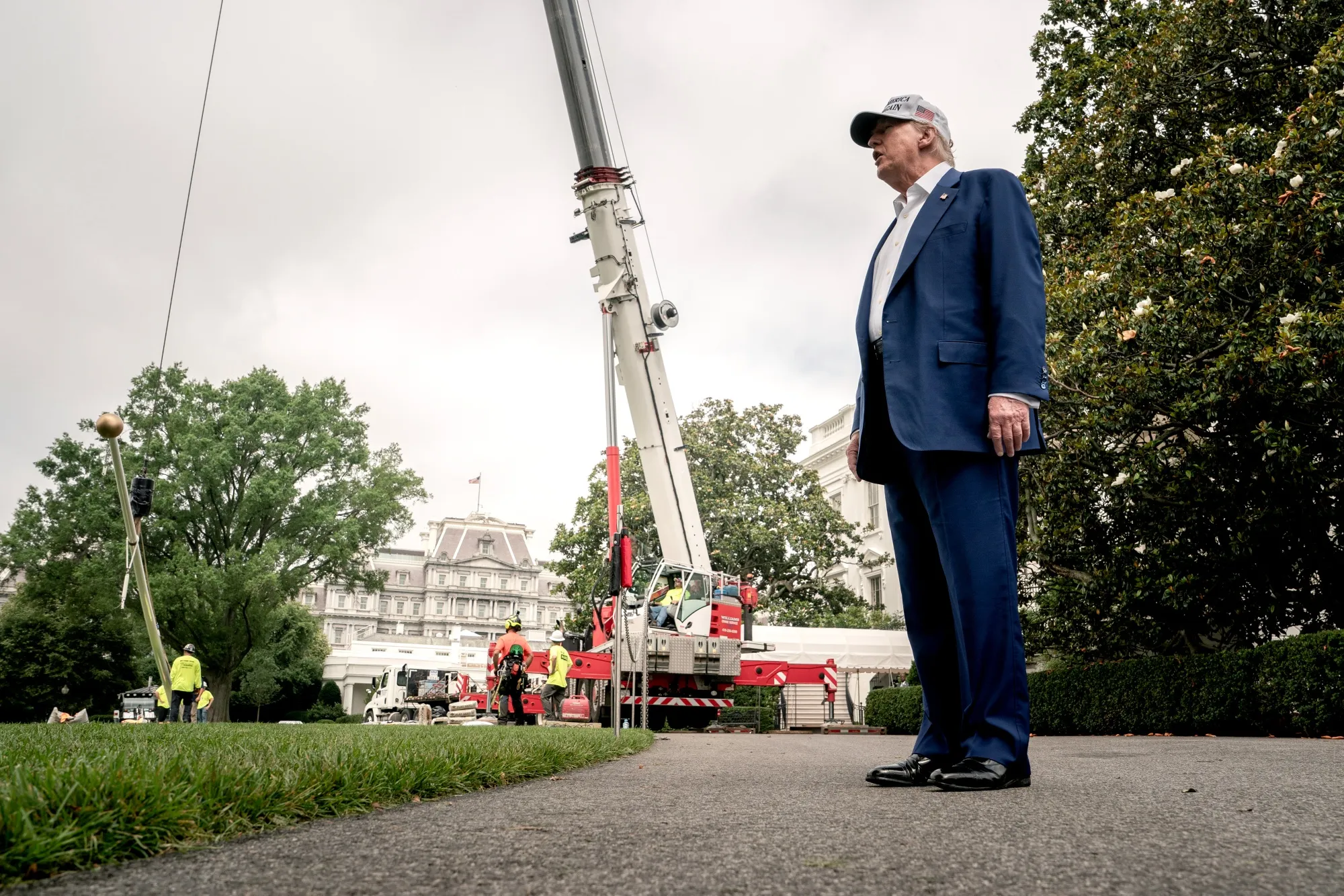 6月18日,唐納德·特朗普在華盛頓特區白宮南草坪對媒體發表時,工作人員正在安裝新旗杆。攝影師:肯·塞德諾/UPI/彭博社若特朗普真如威脅般介入衝突,海灣國家被捲入戰爭的風險將加劇。