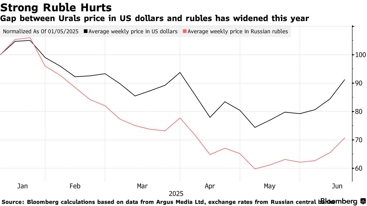 這使得俄羅斯相較於沙特等貨幣與美元掛鈎的OPEC+夥伴國處於劣勢。對財政收入約三分之一依賴油氣、且大部分支出以盧布計價的俄政府而言,可支配資金更為拮据。