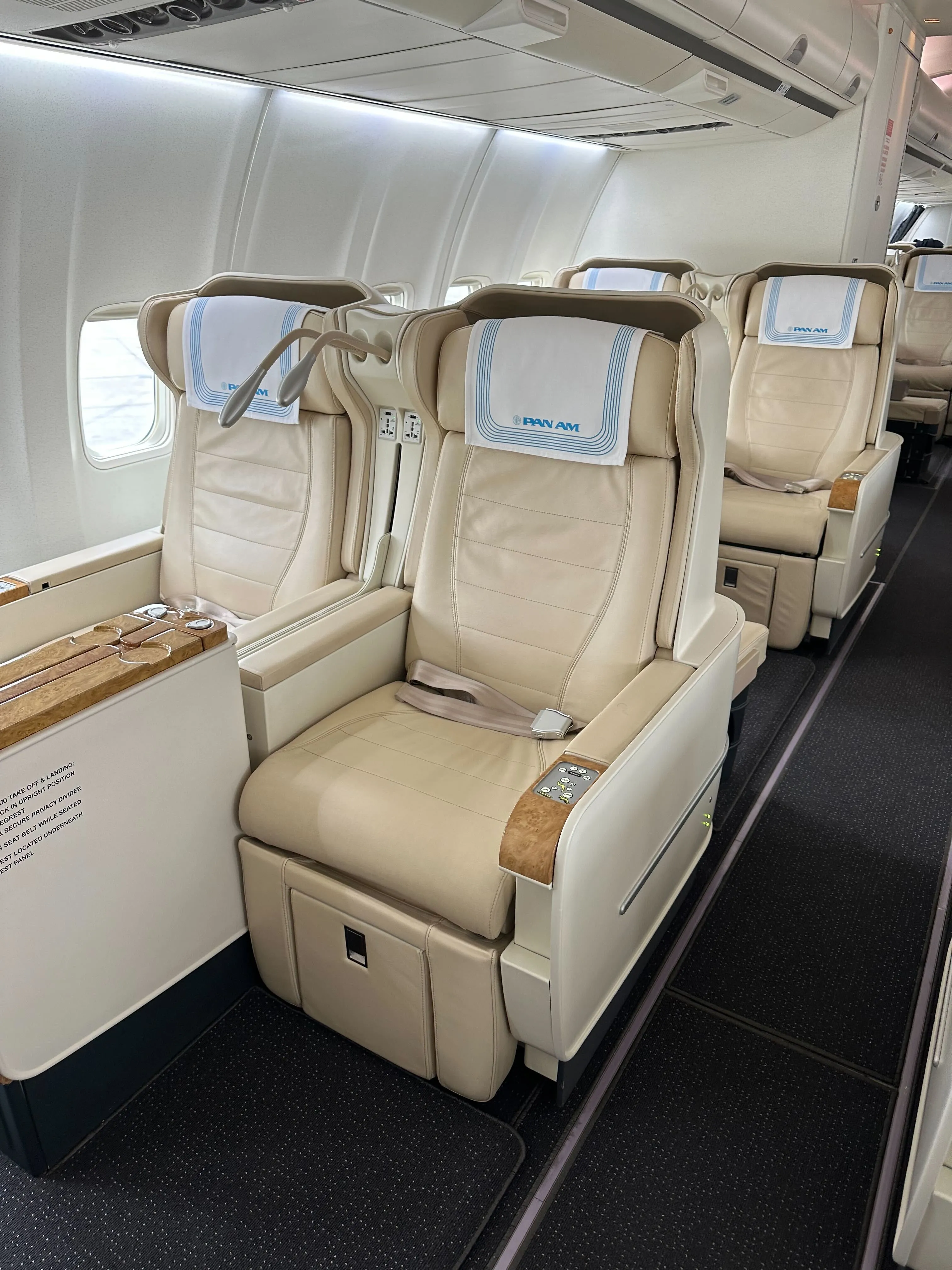 這架定製波音757設有30排寬敞頭等艙座椅。過道雖寬,卻遺憾未能還原泛美頭等艙標誌性的桌邊牛排服務——當年乘務員現場切肉的場景已成傳奇。不過香檳供應充足。單段航程均不超過七小時,但乘客可完全放平座椅休息(洗手間雖經升級,終究只是飛機洗手間)。