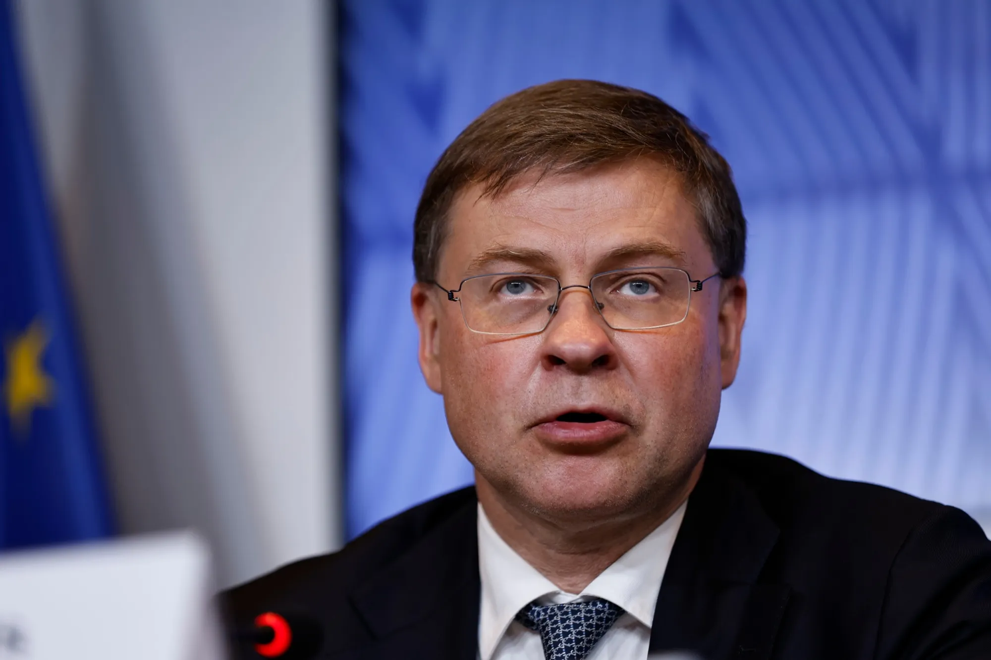 歐盟經濟事務專員瓦爾季斯·東布羅夫斯基斯於6月19日在盧森堡歐元集團會議後召開新聞發佈會。