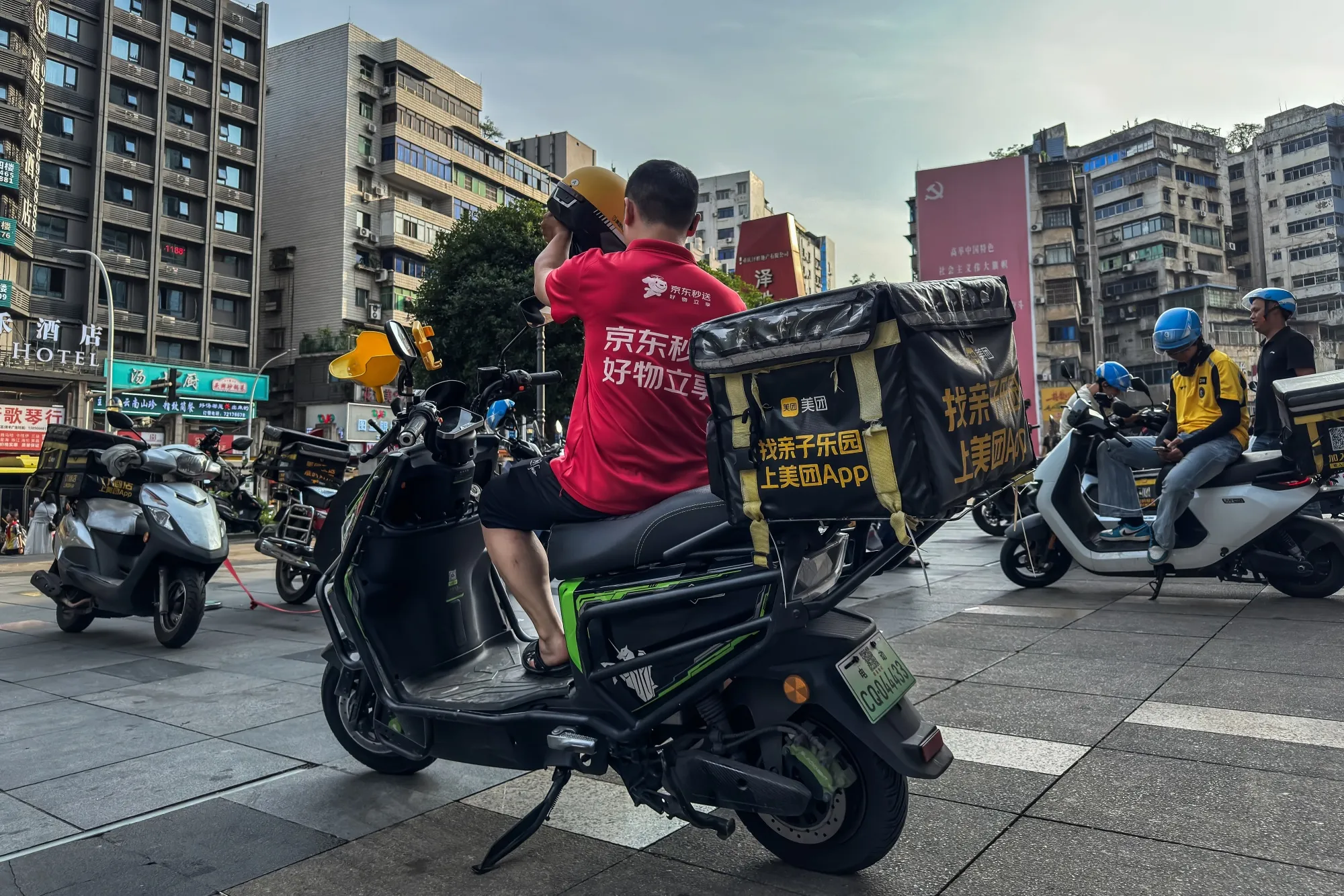 京東贏得了像蔣小希(音)這樣的騎手青睞。這位深圳外來務工人員曾在疫情前加入美團,去年為照顧湖南老家患病的祖父而離職。今年25歲的她重返深圳時選擇了京東,因為這裏提供規律的8小時工作制,她還説服同伴們集體跳槽。“入職就籤勞動合同,“她説,“全職員工享有社保讓我有歸屬感。”