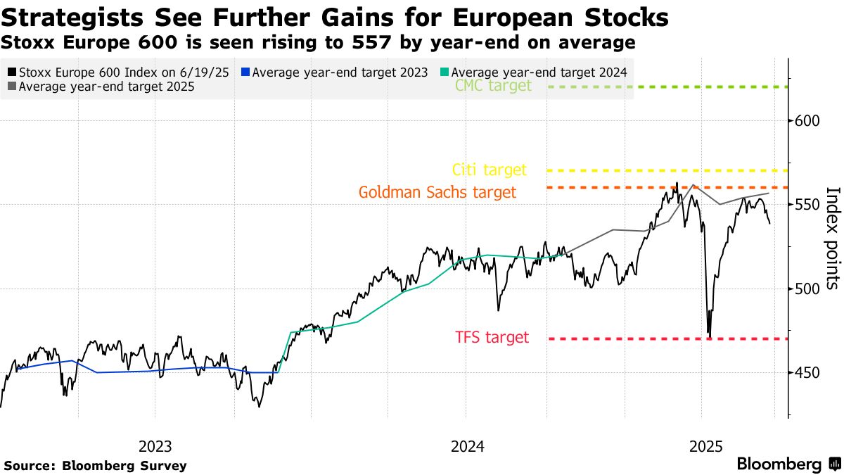 根據彭博對19位策略師的調查平均值,歐洲斯托克600指數預計將在年底收於557點附近。這意味着較週三收盤價還有3%的上行空間,為投資者帶來約10%的年化回報率。