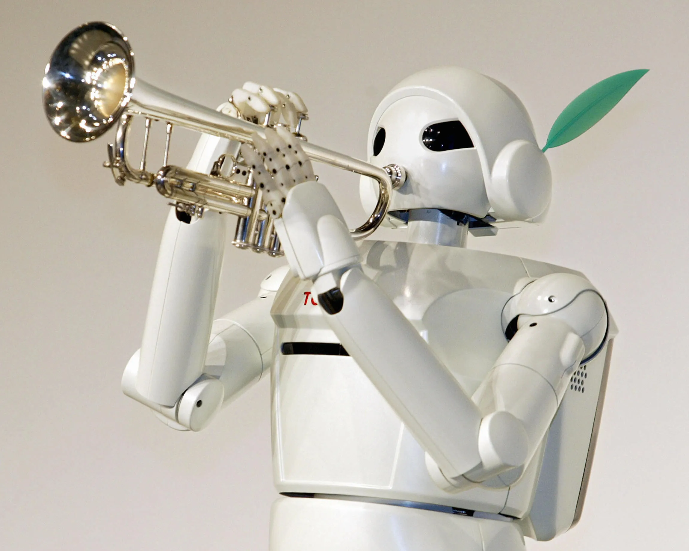 豐田新研發的雙足機器人正在演奏小號。攝影師:山中考託/法新社 via Getty Images萊昂內爾·洛朗撰文指出:AI吞噬者正在蠶食音樂產業。基於人類藝術家創作的海量歌曲訓練的AI工具,如今只需點擊按鈕就能批量生成數百萬首原創曲目。價值200億美元的音樂市場顯然岌岌可危。