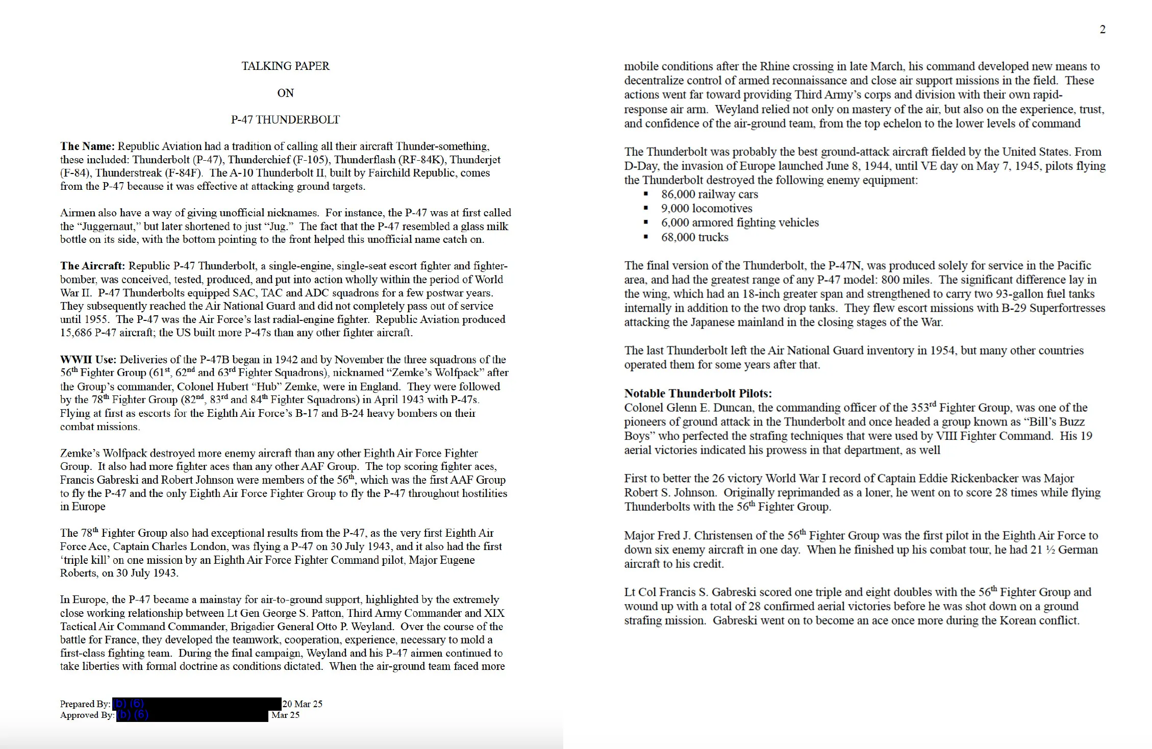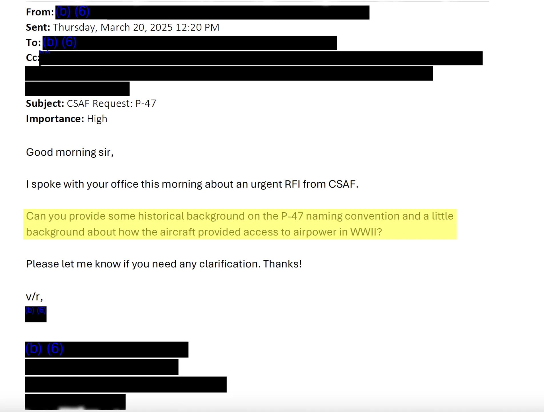 點擊圖片放大(第16和17頁) 奇怪的是,當特朗普宣佈F-47時,他和赫格斯都沒有提及P-47或其歷史遺產。當我查看電子郵件的時間戳時,我突然想到,空軍可能在總統稱新戰鬥機為F-47時措手不及或準備不足。