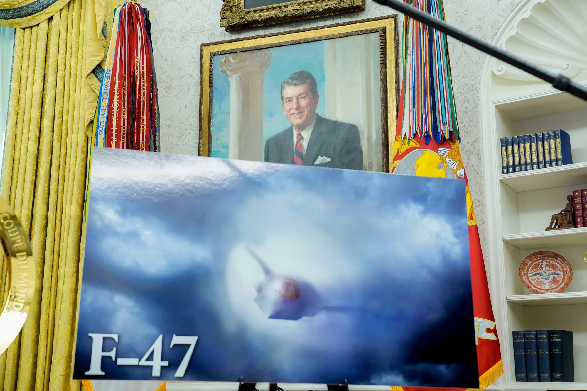 3月21日,橢圓形辦公室展示的新型F-47戰鬥機效果圖。波音公司擊敗競爭對手洛克希德·馬丁,贏得了設計和建造美國下一代戰鬥機的數十億美元合同。