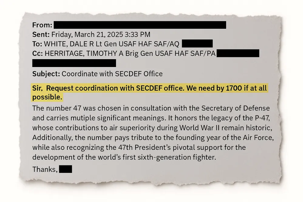 幾周前,空軍回覆了十多封電子郵件和其他一些記錄。這些資料非常有趣,揭示了F-47的命名既源於二戰時期一款標誌性戰鬥機,也包含向特朗普致敬的意圖。