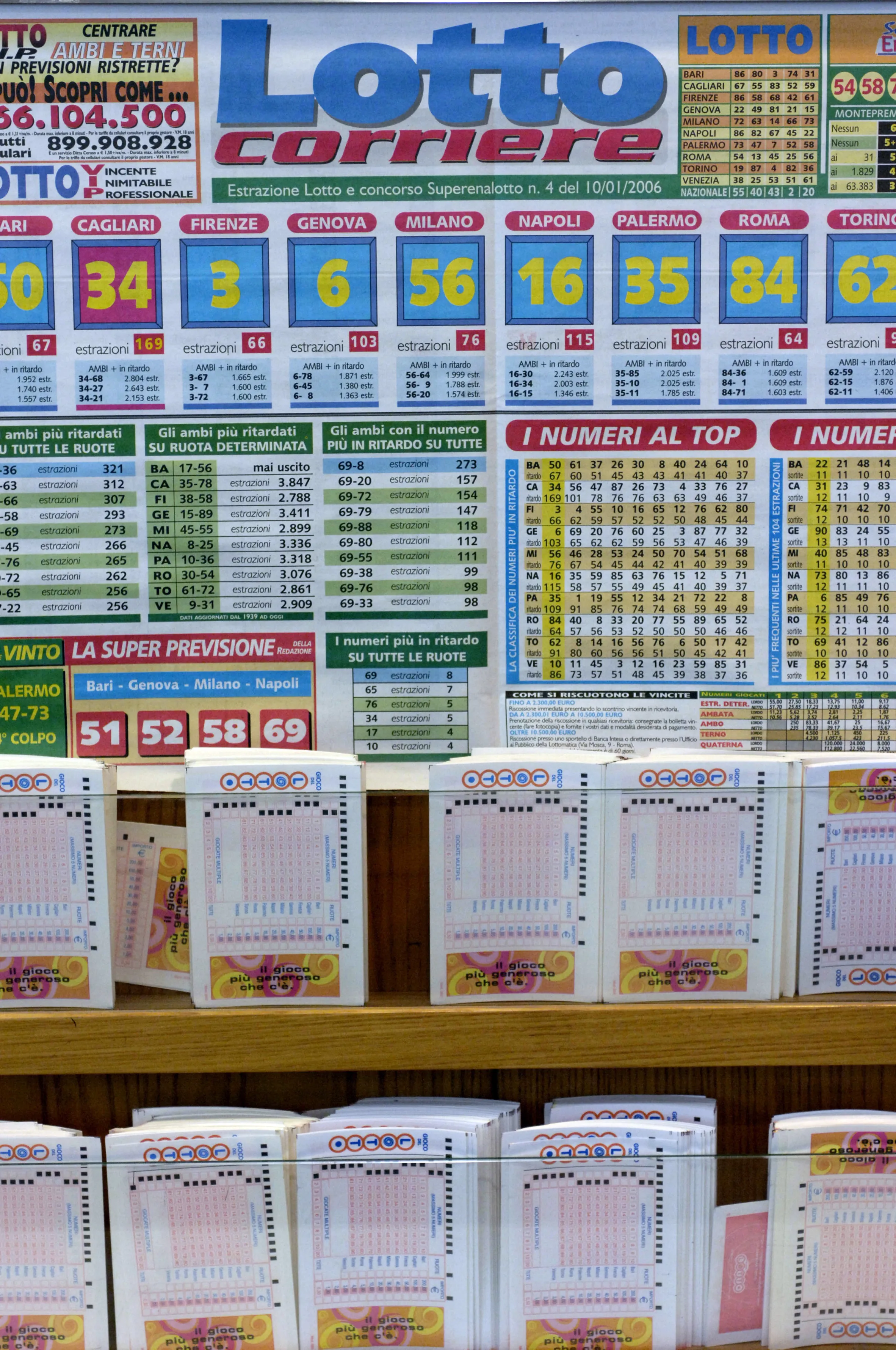 2006年1月11日星期三,意大利羅馬市中心一家煙草店內展示的Lottomatica彩票單。