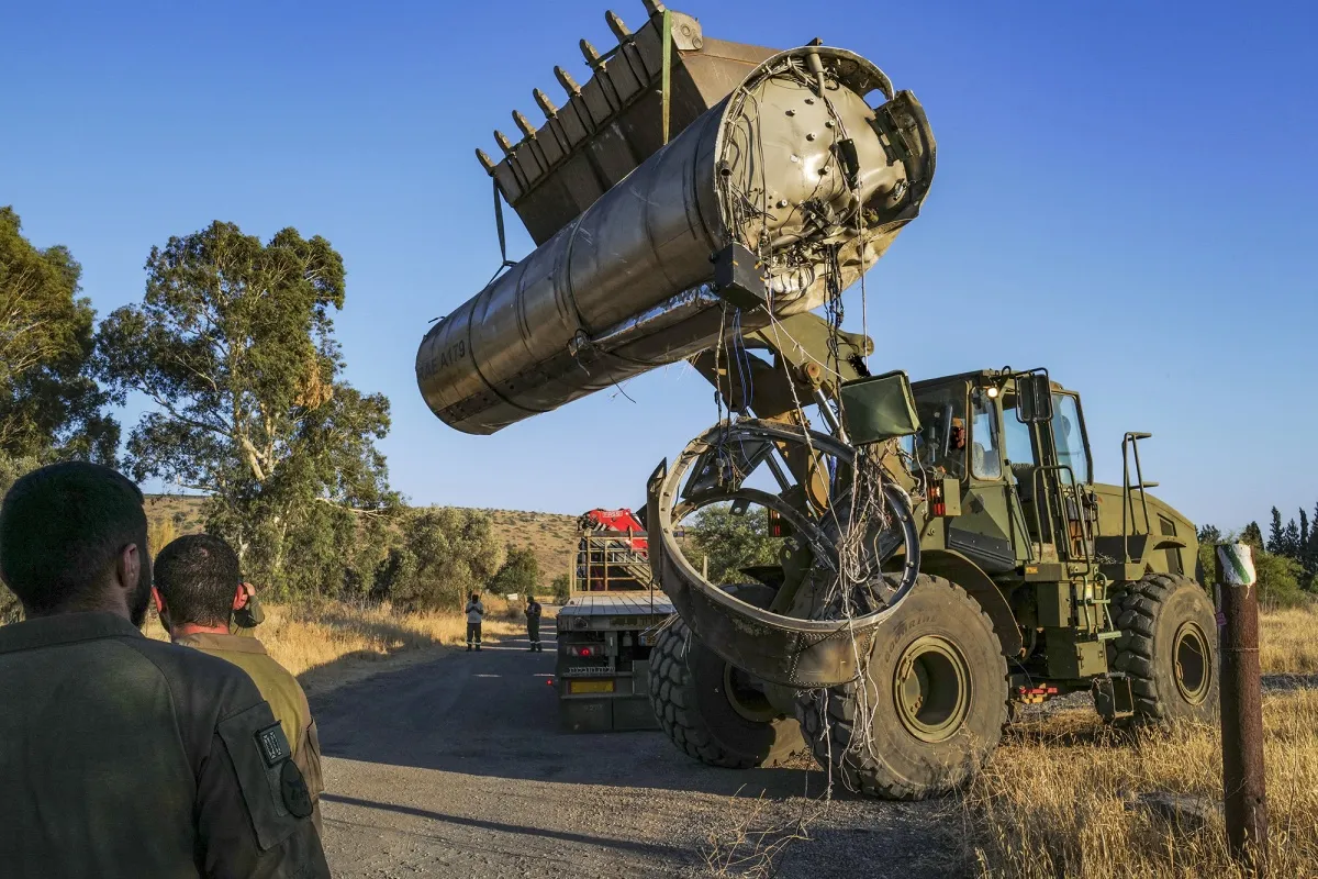 6月19日,以色列特種部隊成員在特拉維夫用裝載機清理一枚伊朗彈道導彈的明顯殘骸。