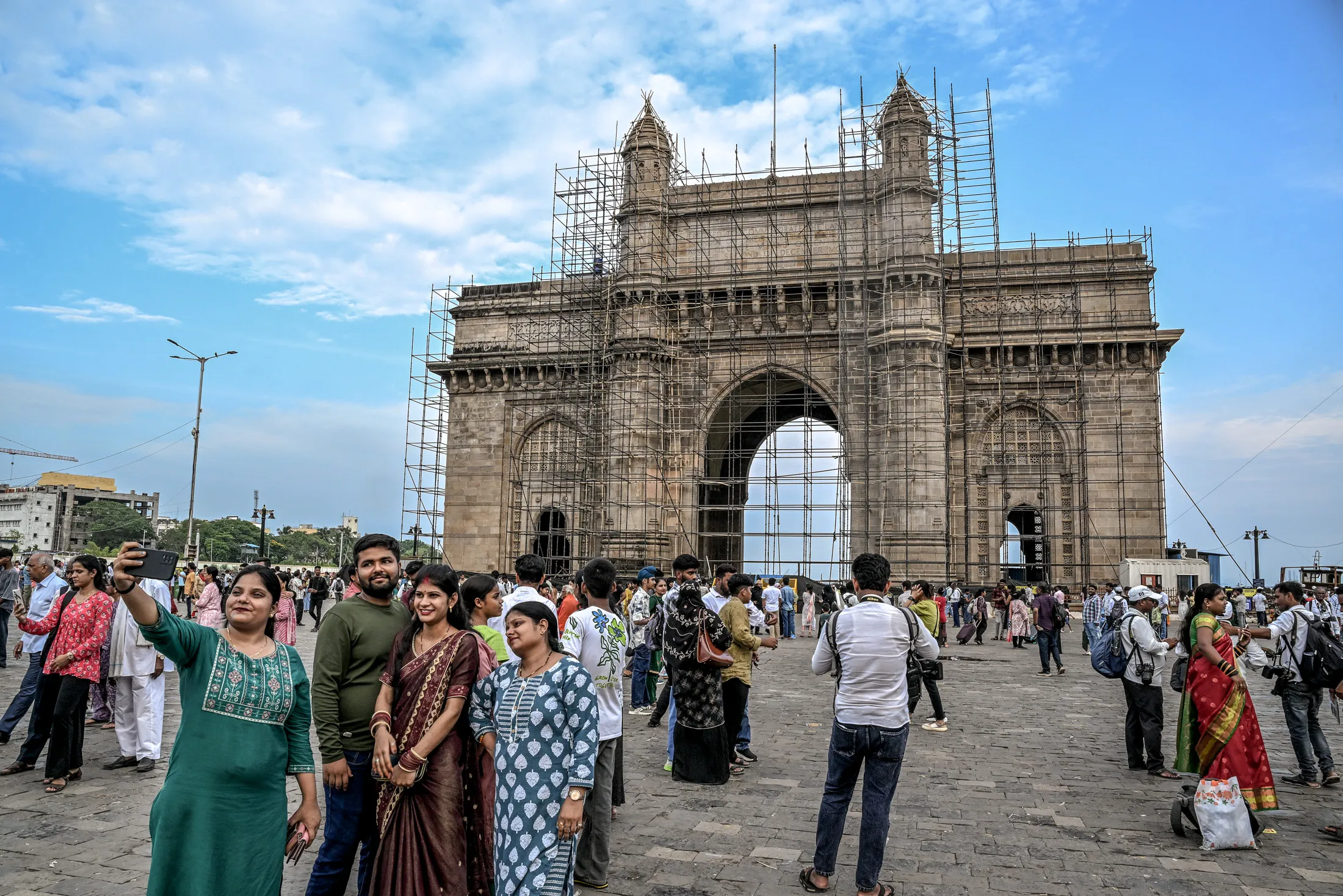 2025年5月21日,遊客們站在印度門前的景象。這座飽受海水侵蝕的紀念碑在多年風化損毀後正進行大規模修復。