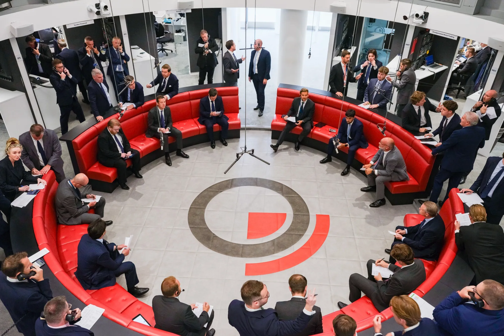 倫敦金屬交易所公開喊價交易池內的交易員、經紀人與職員工作場景。