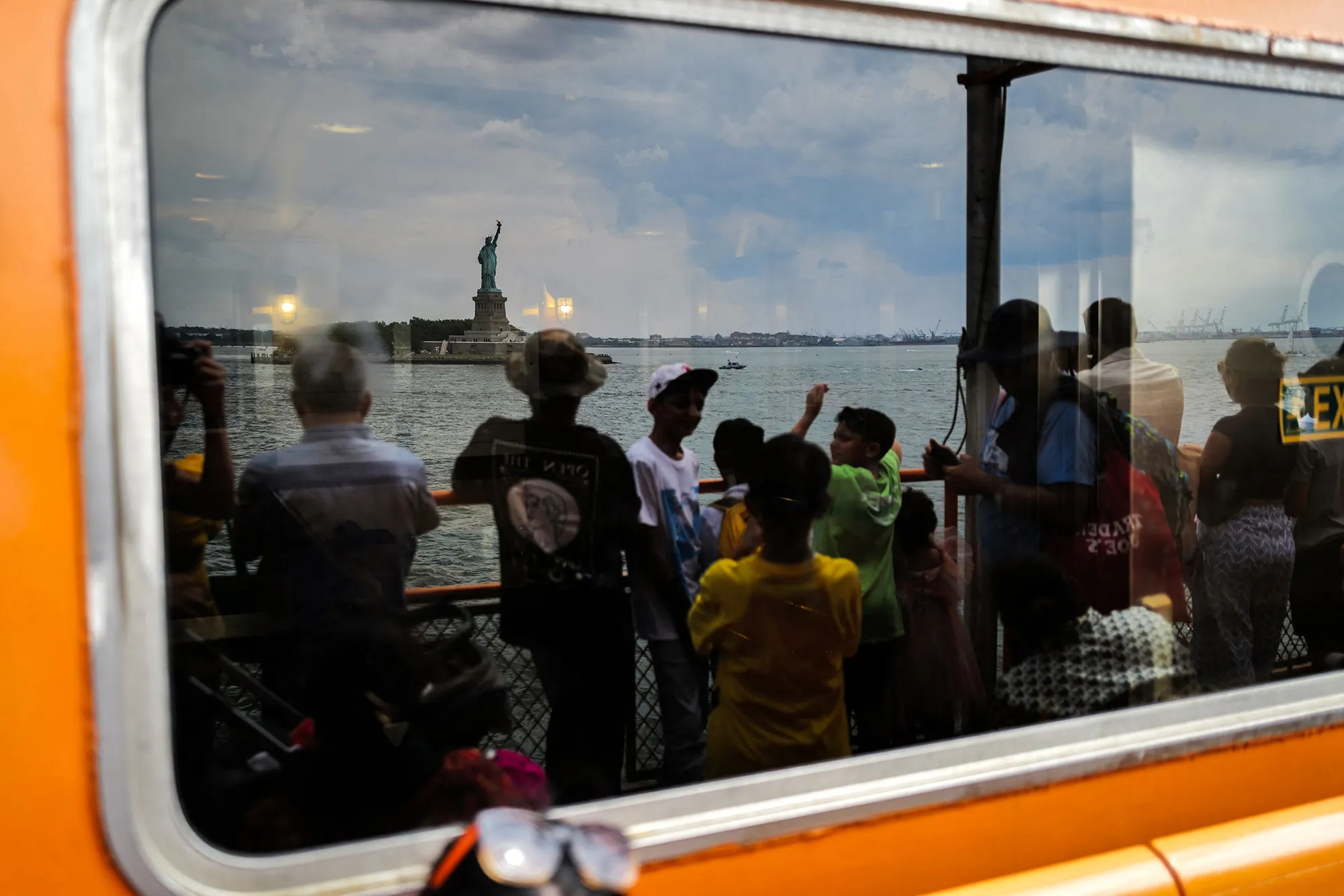 紐約史坦頓島渡輪上的乘客與自由女神像的倒影。