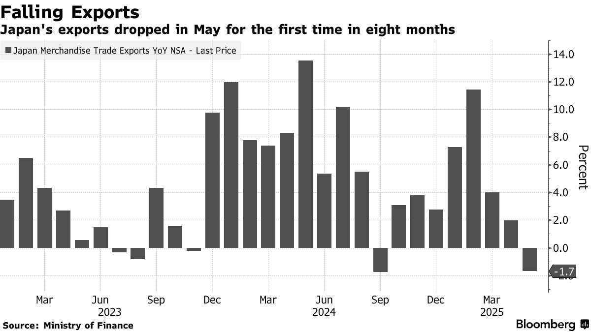 受美國關税戰拖累全球貿易影響,日本出口出現八個月來首次下滑,在年初經濟萎縮後技術性衰退風險上升。5月出口額同比減少1.7%,而出口量增長1.8%,表明出口商或正通過降價消化關税衝擊。