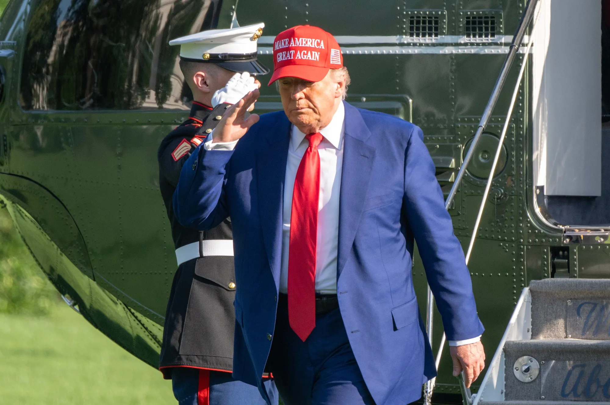 6月21日,唐納德·特朗普總統在華盛頓特區乘坐海軍陸戰隊一號抵達後,步行穿過白宮南草坪時敬禮。