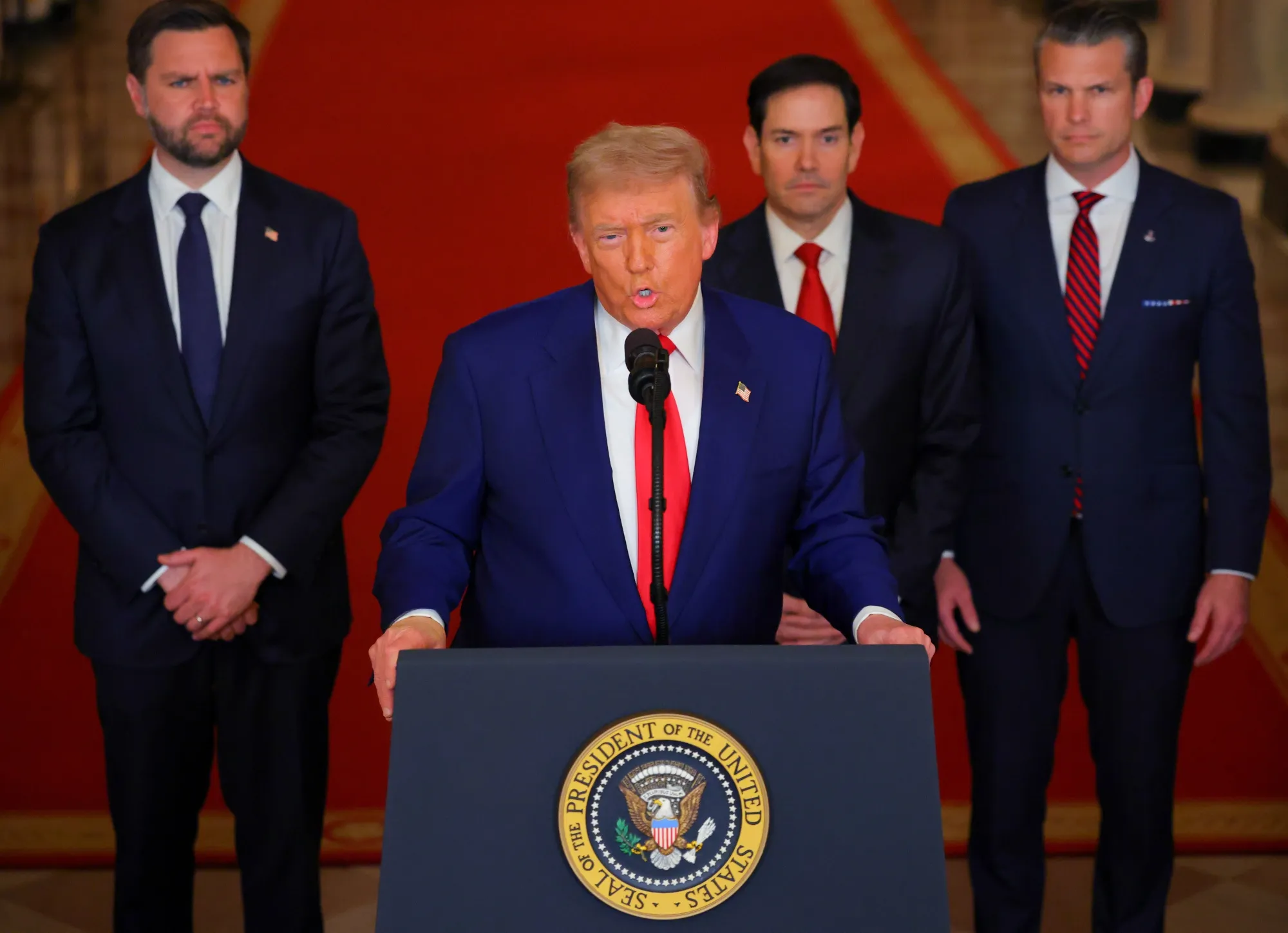 特朗普身旁站着副總統JD·萬斯、國務卿馬可·魯比奧和國防部長皮特·赫格塞斯。總統表示,國防部長將於週日舉行新聞發佈會,進一步討論此次打擊行動。