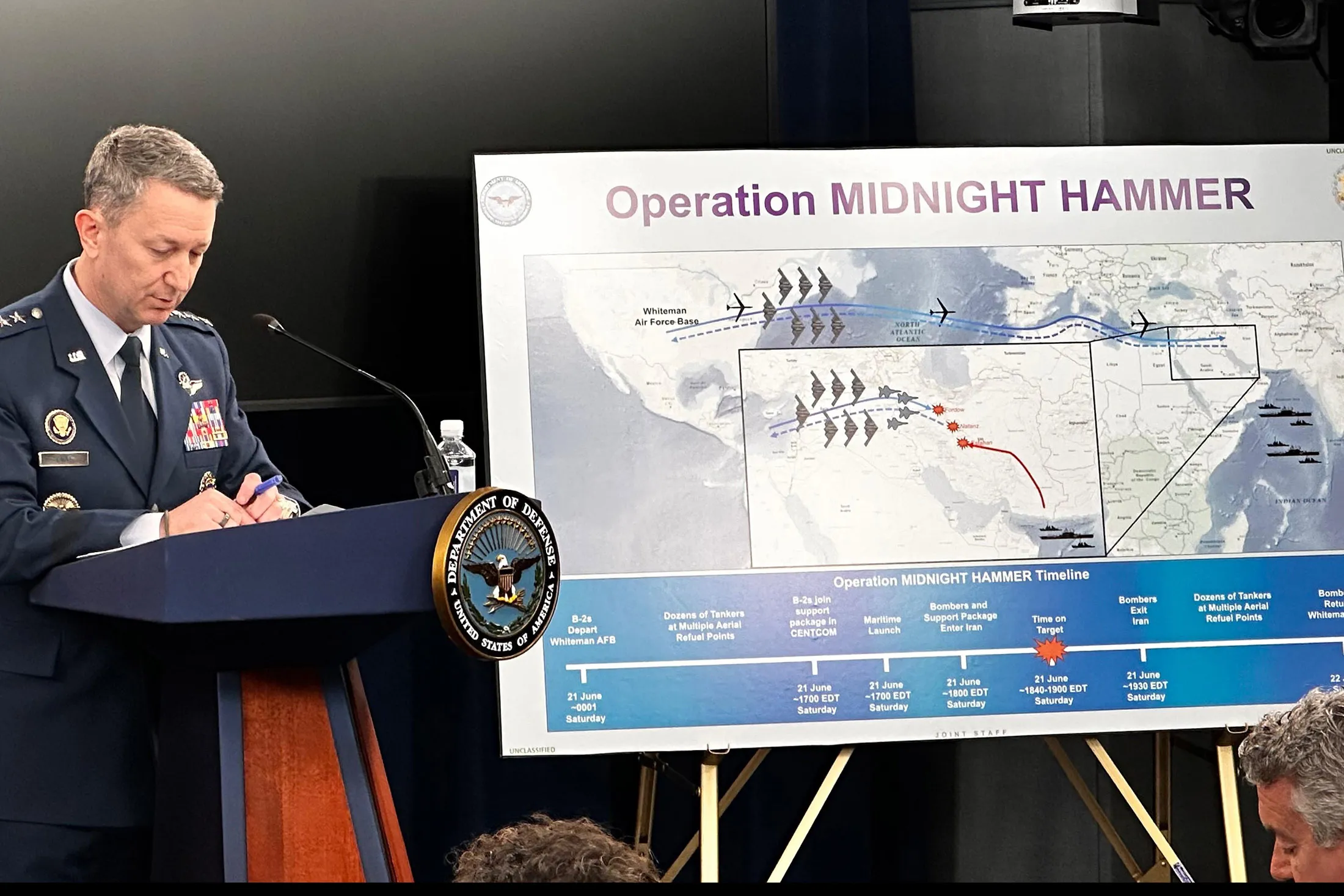 空軍上將、參謀長聯席會議主席丹·凱恩在五角大樓通報了代號"午夜鐵錘"的對伊行動細節。行動出動了B-2隱形轟炸機、潛艇、精確制導武器及鑽地炸彈。(英文視頻)