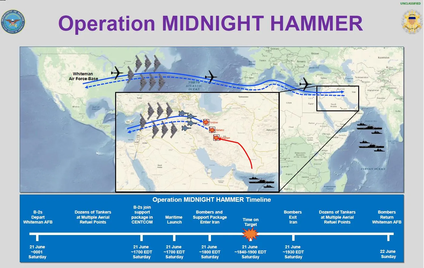 這項代號"午夜鐵錘"的行動於週日清晨由五角大樓高級官員詳細披露。他們描述了一場包含125架戰機、從美軍潛艇發射的戰斧導彈以及14枚巨型鑽地彈的大規模任務。
