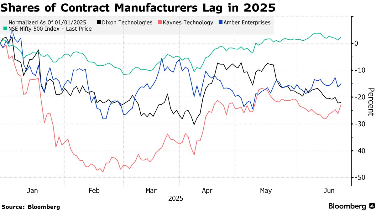 電子代工企業今年表現遜於大盤,受利潤率擔憂和2024年大漲後估值過高的拖累,許多企業股價已翻倍。行業龍頭迪克森正因手機生產掛鈎激勵計劃(PLI)是否延期而日益焦慮——該計劃將於2026年到期。若不予延期,利潤率恐將受壓。雖然行業收入增長毋庸置疑,但關鍵在於能否保持可觀盈利。