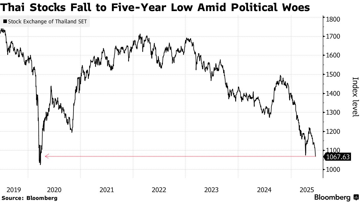 泰國基準SET指數上週跌至五年低點,因總理貝東丹·西那瓦政府穩定性的不確定性給經濟前景蒙上陰影。執政聯盟內部日益擴大的分歧可能阻礙關鍵立法,破壞與美國關税談判,並動搖投資者對已經表現不佳的泰國資產的信心。