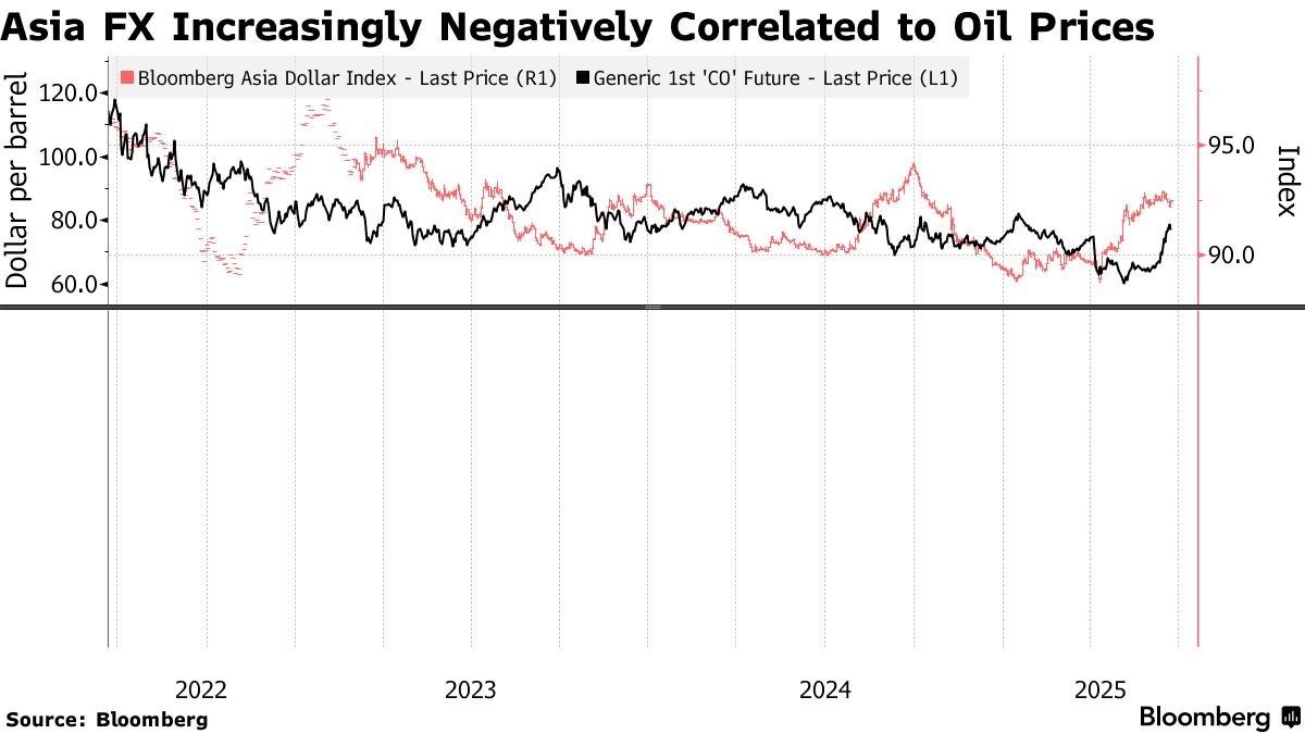 根據彭博社的計算,反映出潛在的連鎖反應,布倫特原油期貨與亞洲美元即期指數之間的30天相關性目前達到自2022年3月以來最負值,讀數為-0.45。