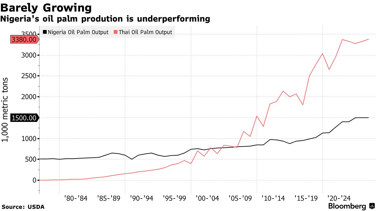“尼日利亞大部分棕櫚油仍產自小農户,“皮萊指出,“許多種植園已超25-30年樹齡,產量持續下滑。若能用高產種苗更新這些老種植園,增產速度將大幅提升。”