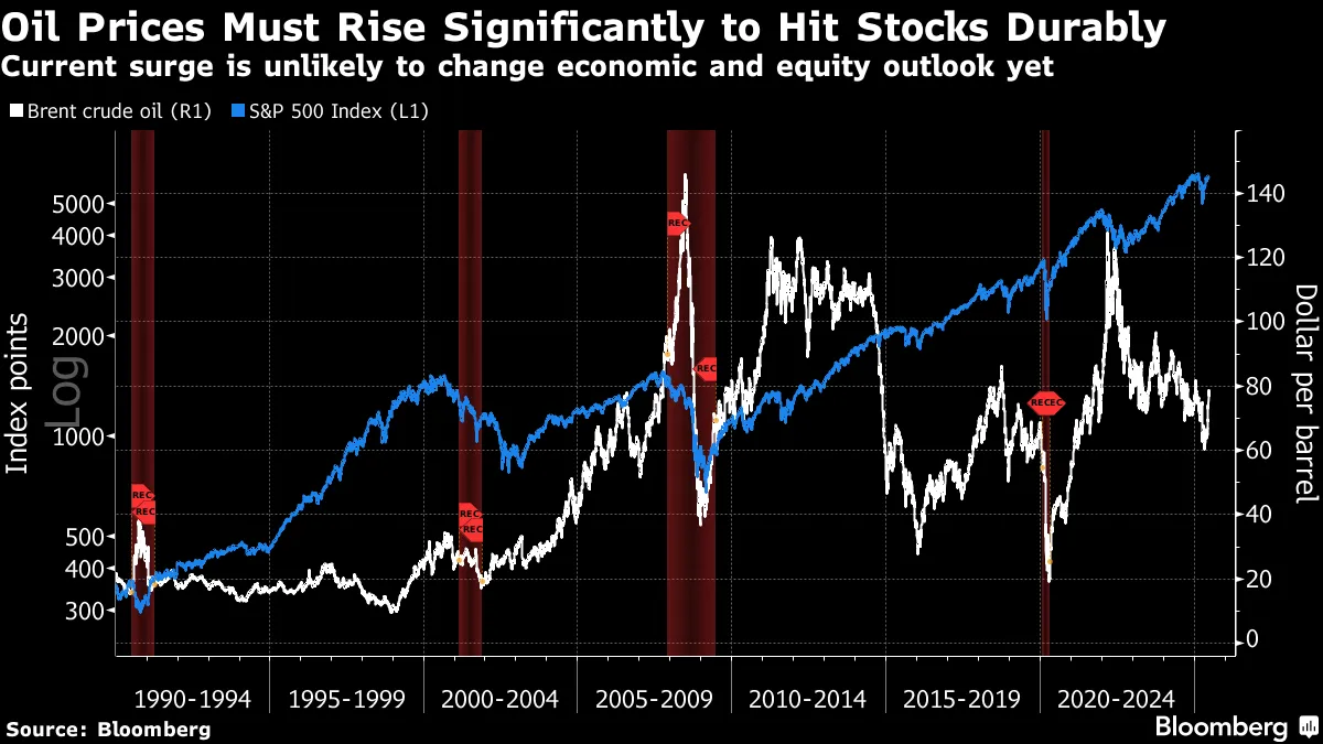 對於威爾遜和他的團隊來説,油價飆升必須非常顯著才能引發熊市情景。根據他們的分析,石油價格需要達到每桶120美元才會對經濟週期構成威脅。