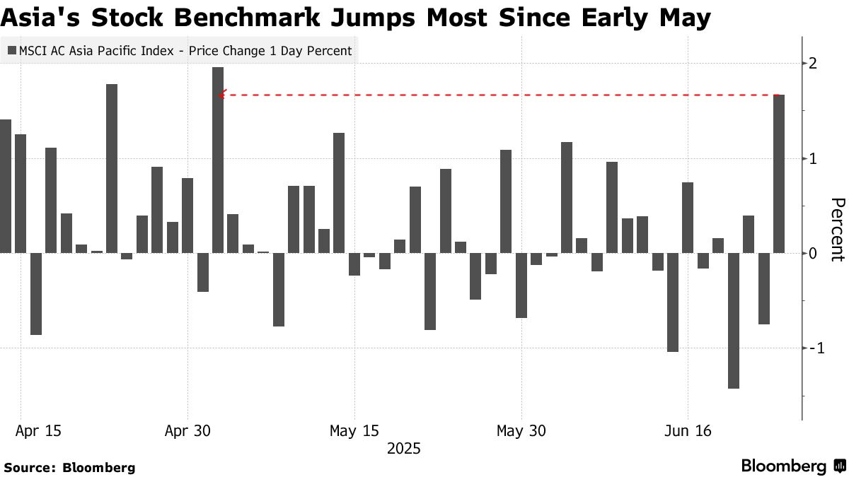 亞洲股市基準指數創下七週來最大漲幅,科技股領漲。此前美國總統特朗普宣佈以色列和伊朗達成臨時停火協議,風險情緒有所改善。