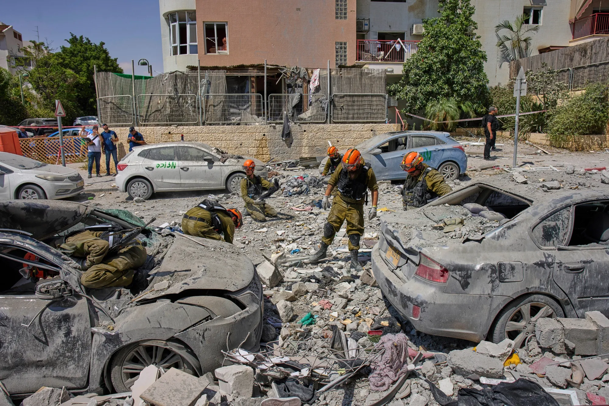 6月24日,以色列貝爾謝巴市遭伊朗導彈襲擊後,以軍士兵在廢墟中展開作業。