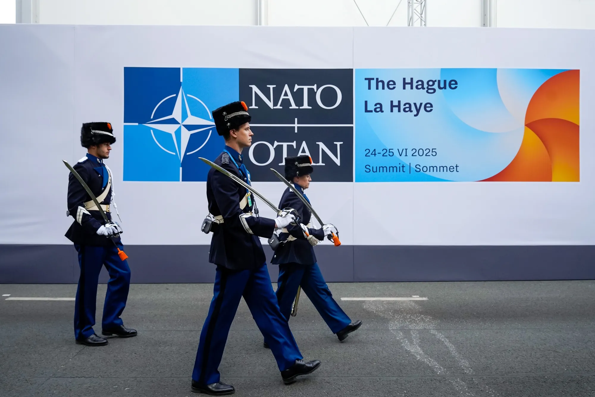 荷蘭皇家憲兵隊成員在北約峯會期間列隊行進。攝影師:Lina Selg/Bloomberg### 全球必讀