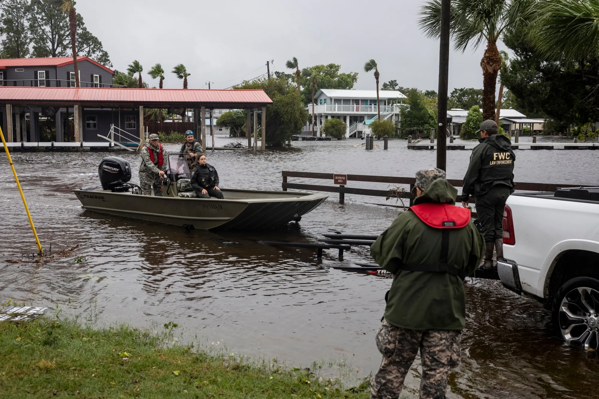 2024年8月5日,颶風"黛比"登陸佛羅里達州蘇萬尼後,搜救被困居民的警員們返回。