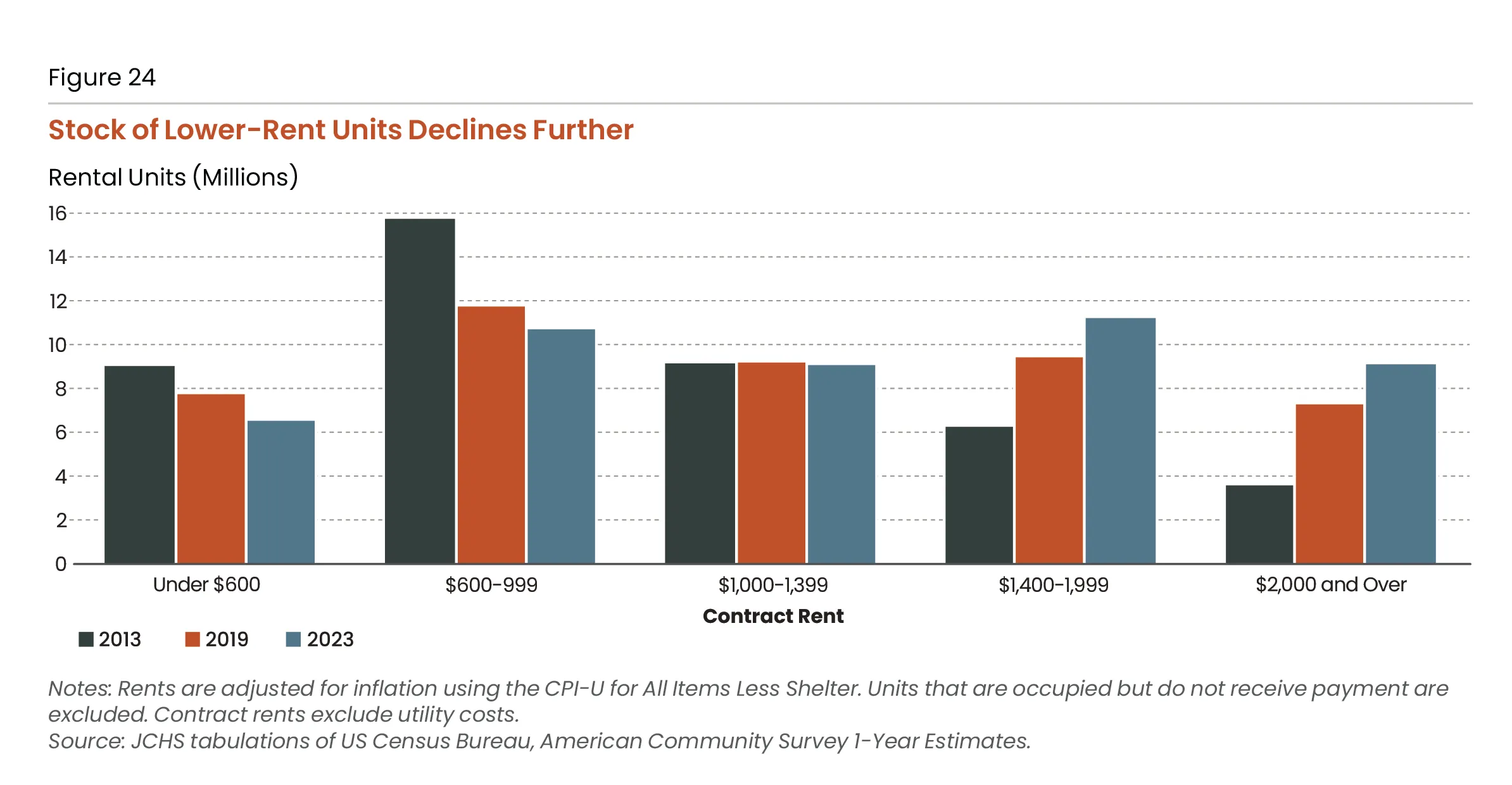 關鍵變化在於高價市場租賃住房的激增。經通脹調整後,2013至2023年間月租低於1000美元的房源減少了30%,而月租超2000美元的公寓存量則從360萬套增至910萬套,增長兩倍。