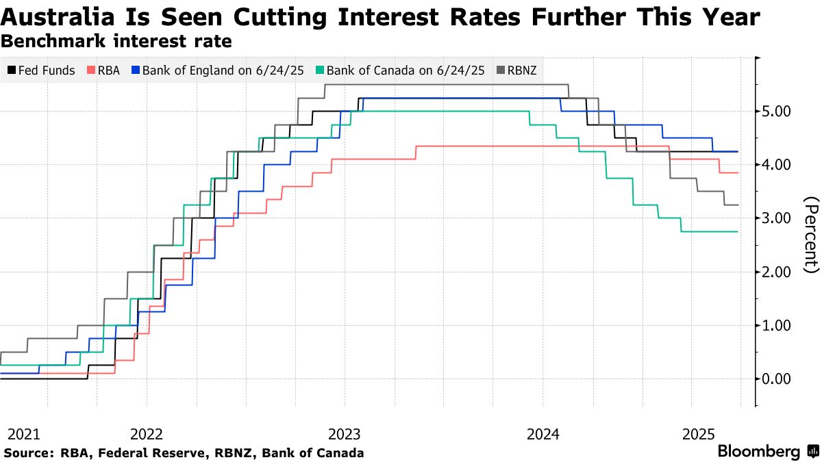澳洲聯儲上個月將現金利率下調25個基點至3.85%,為今年第二次降息,因政策制定者認為物價壓力再次爆發的風險正在減弱。行長Michele Bullock在決定後暗示,隨着貿易動盪和地緣政治動盪成為焦點,她更擔心經濟增長的下行風險。
