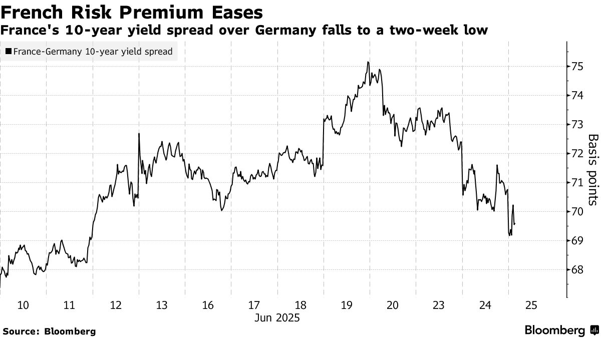法國債券週三上漲,表現優於德國債券,並將兩國10年期債券利差縮小至69個基點,為兩週來最小。這標誌着利差的急劇逆轉,上週利差曾達到75個基點,為4月以來最寬。