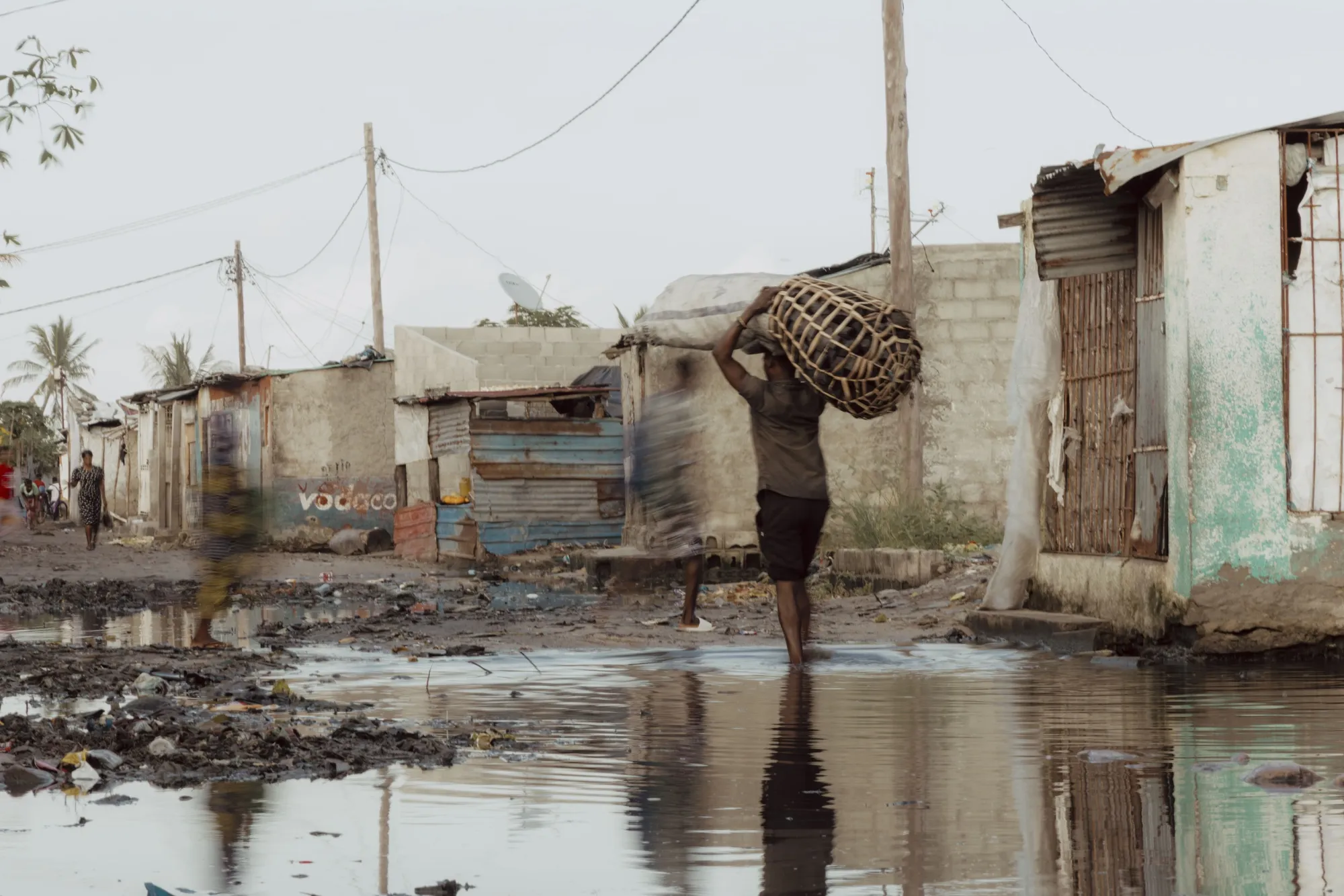 2024年3月20日,莫桑比克貝拉市普拉亞諾瓦社區,居民們走過一條被洪水淹沒的街道。