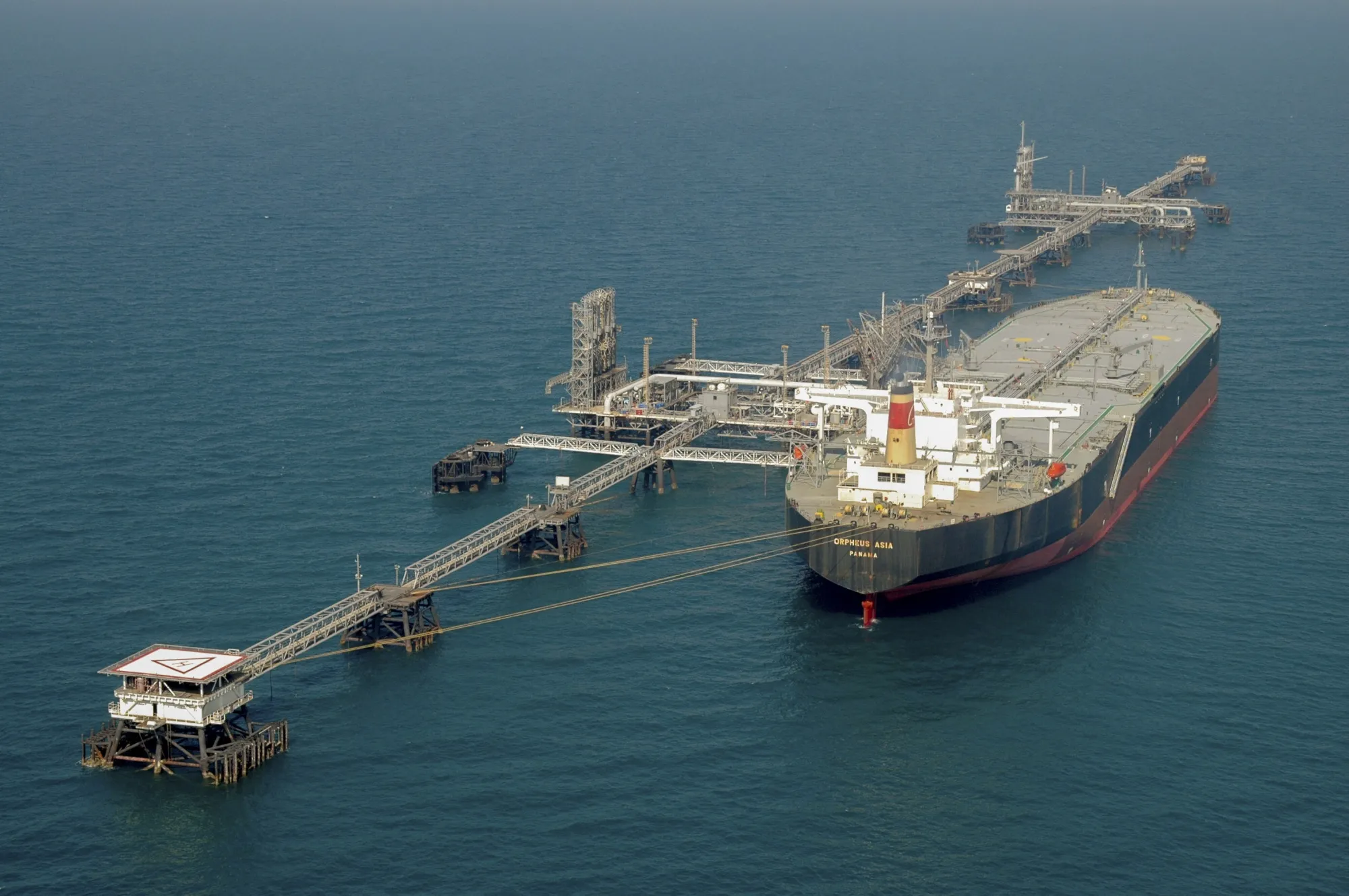一艘原油油輪停泊在波斯灣近海碼頭。