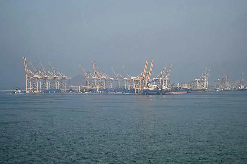 霍爾木茲海峽沿岸沙迦酋長國豪爾費坎集裝箱碼頭的油輪。