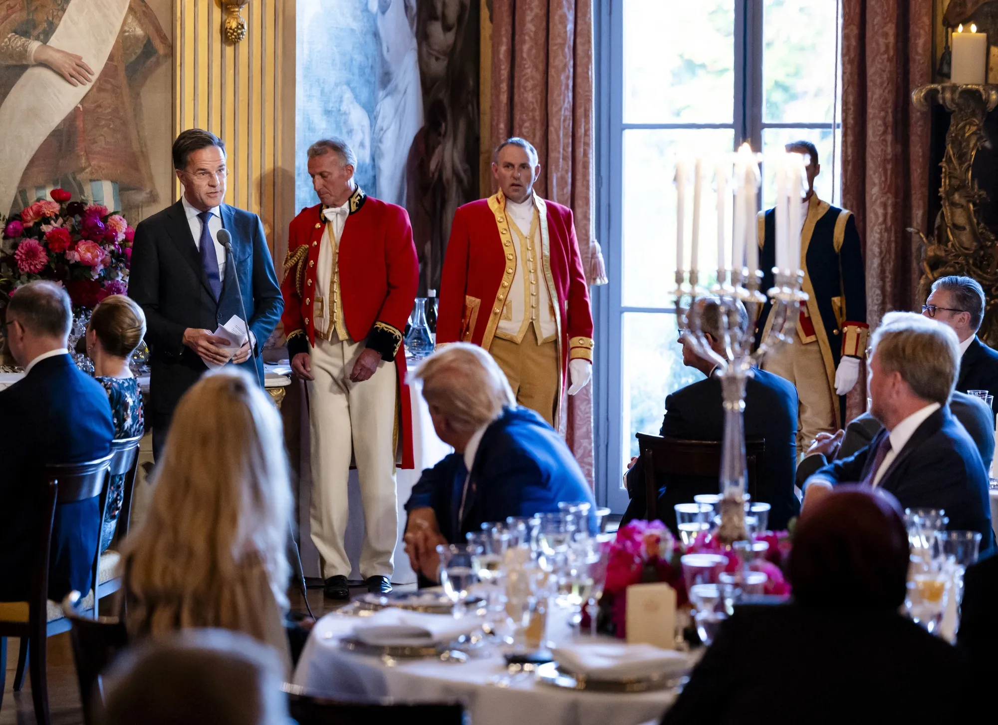 特朗普出席荷蘭王室國宴。攝影師:Mischa Schoemaker/ANP/AFP/Getty Images荷蘭首相馬克·呂特與國王在國宴演講前反覆推敲措辭,並精心安排座次——特朗普青睞的意大利總理喬治婭·梅洛尼被安排在鄰座。伴着炭烤金槍魚和小牛裏脊上桌的,還有專為一人奉上的溢美之詞。