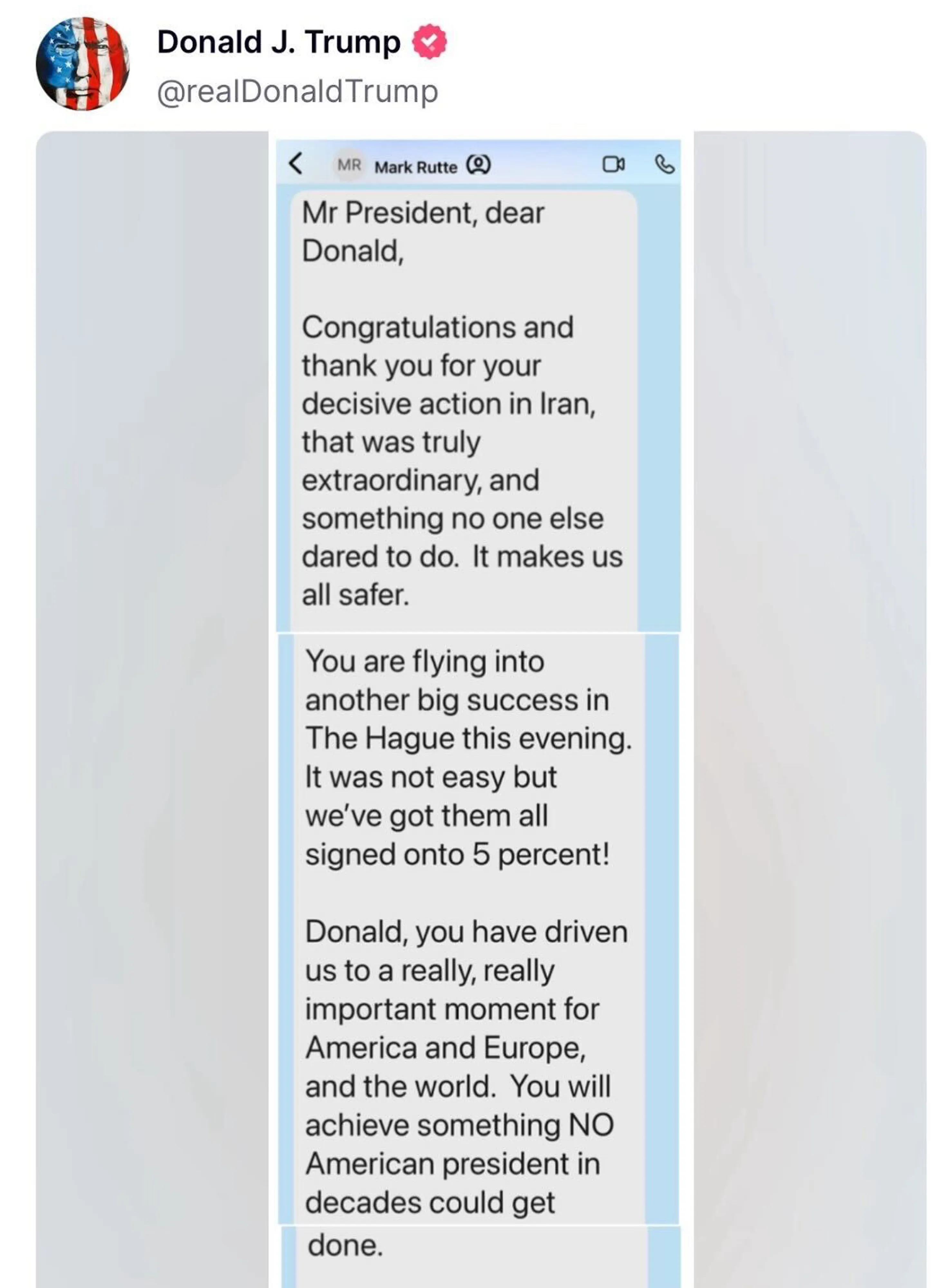 特朗普在Truth Social平台泄露呂特發給他的私人短信。來源:Truth Social有時,呂特表現得過於誇張,讓人看着都尷尬。週三與總統並肩坐在攝影師面前時,他聽着特朗普描述自己如何讓伊朗和以色列停火。