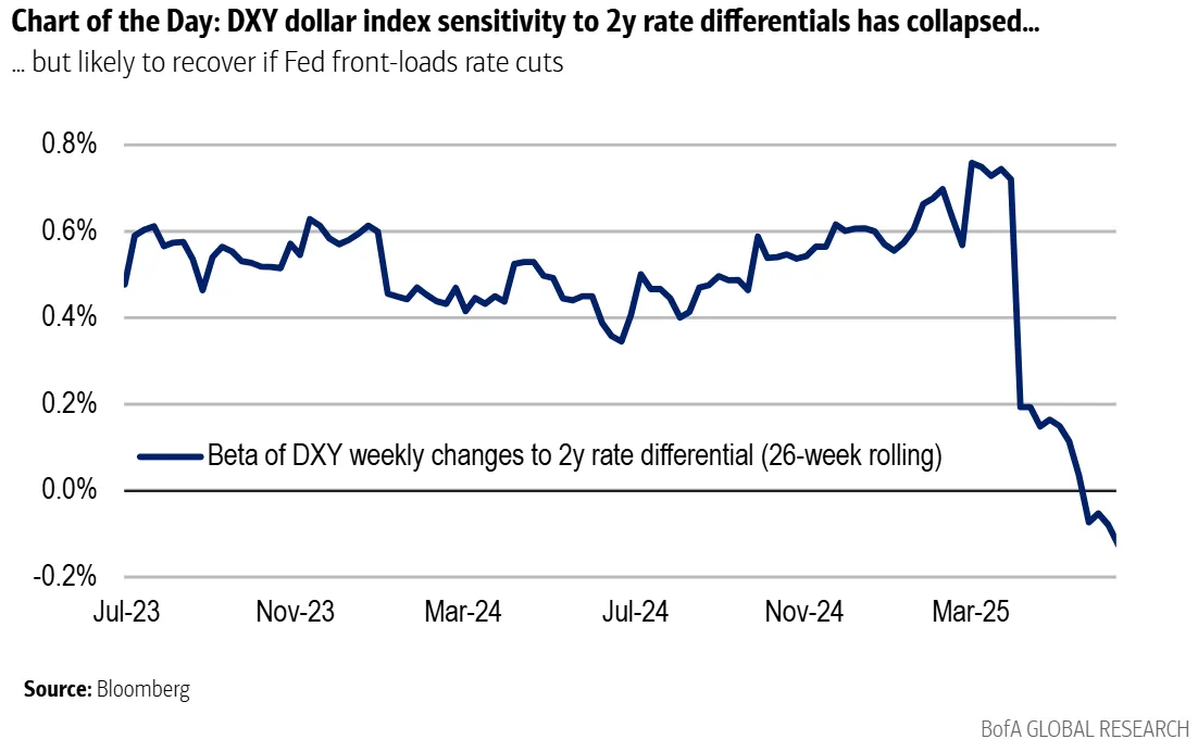 自解放日及其後續逆轉以來完全未變的,是美元與利差關聯的斷裂。通常貨幣會因高於其他地區的債券收益率獲得支撐,因這會吸引資金流入。但此次並未發生。正如美國銀行Adarsh Sinha的圖表所示,這種關聯性持續減弱: