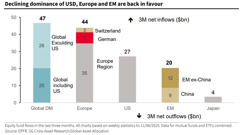 近期資金流向對歐洲有利;這一趨勢可能持續。法國興業銀行數據顯示,過去三個月歐洲基金的資金淨流入實際已超越美國,同時資金也流入了排除美國資產的全球基金。目前尚未出現資金外流,因此沒有特別理由認為這一趨勢不會強化。況且其他市場規模較小,任何資金注入都會產生更大的比例效應: