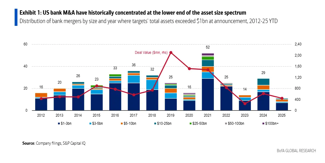 除了預測交易復甦外,投資者還需識別收購目標,並判斷是否押注潛在買家。伯曼的分析印證了市場共識:交易宣佈後,被收購方表現持續優於收購方。這張美國銀行圖表展示了近13年銀行併購規模的分佈: