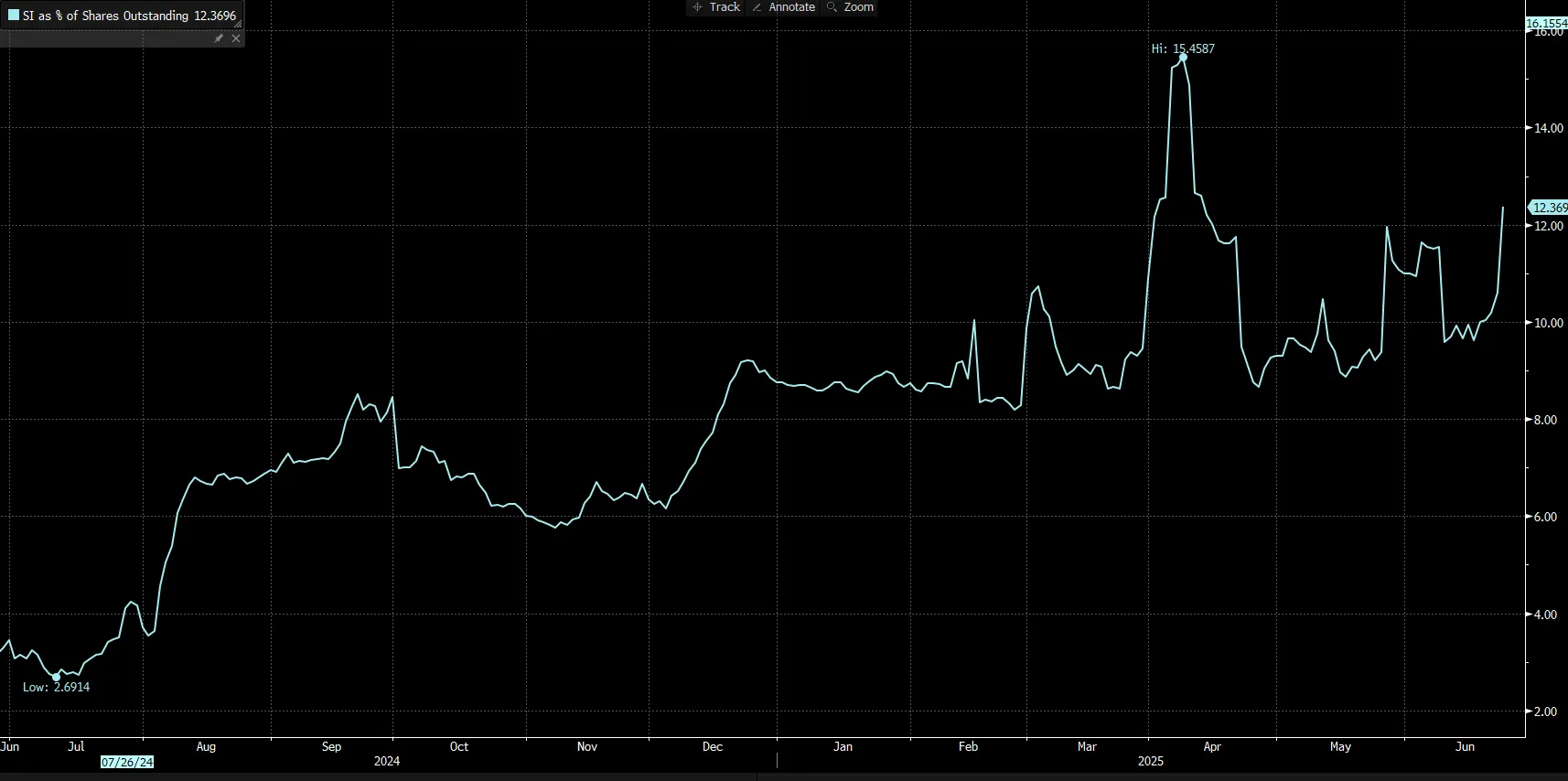 根據標普全球市場情報彙編的數據,截至週二,2030年到期的債券借出量(衡量做空興趣的指標)升至近7800萬歐元,是6月12日水平的三倍多。與此同時,數據顯示過去一週以流通股借出百分比衡量的做空興趣上升了逾兩個百分點。週三的股票拋售使該公司市值蒸發5億歐元(5.85億美元)。