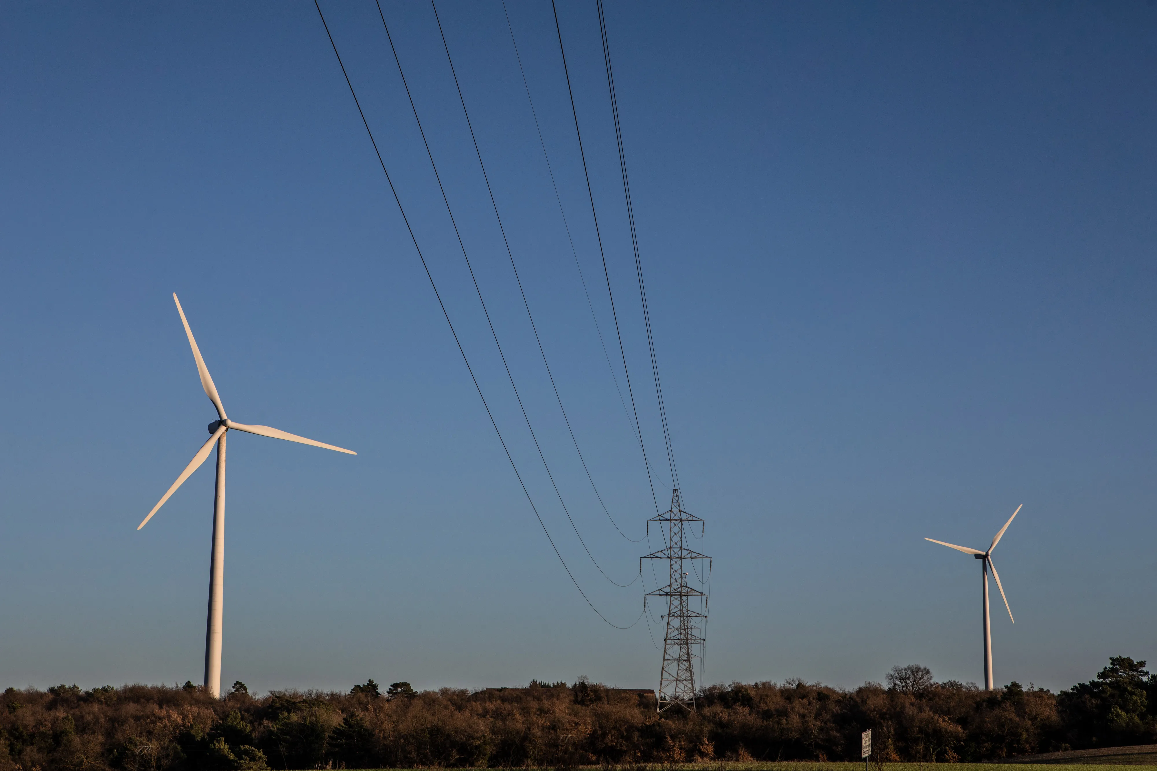 西班牙加泰羅尼亞地區風力發電機間的輸電塔與電纜。