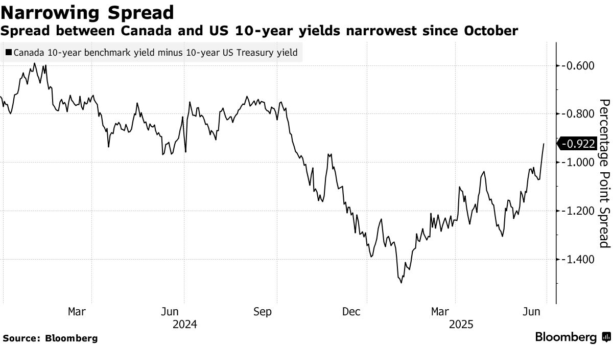 自3月底以來,加拿大10年期基準國債收益率已上漲38個基點,與美債的利差收窄。換言之,加拿大相對於美國的借貸成本優勢正在減弱。