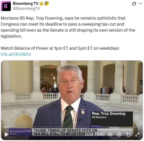 今天下午1點,彭博電視台的權力平衡早間節目中,主持人喬·馬修和凱莉·萊因茨採訪了蒙大拿州共和黨眾議員特洛伊·唐寧,討論了特朗普的減税和支出法案在國會通過的情況以及加密貨幣立法的未來。