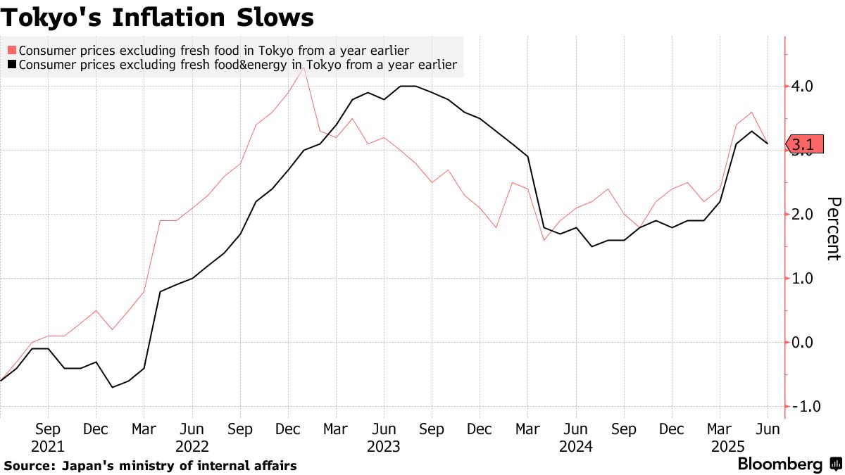 日本總務省週五數據顯示,6月首都圈除生鮮食品外的消費者價格同比上漲3.1%,低於經濟學家預估中值3.3%。整體通脹率同樣降至3.1%,較5月的3.4%有所放緩。