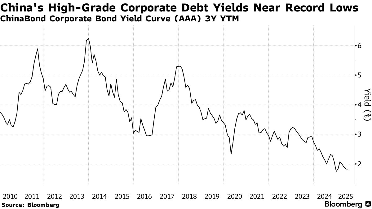 然而隨着債券需求上升,投資者不得不接受更低迴報。根據中債指數,AAA級三年期公司債平均收益率自3月觸及高點後已下跌近40個基點至1.81%,接近1月份創下的1.67%歷史低點。