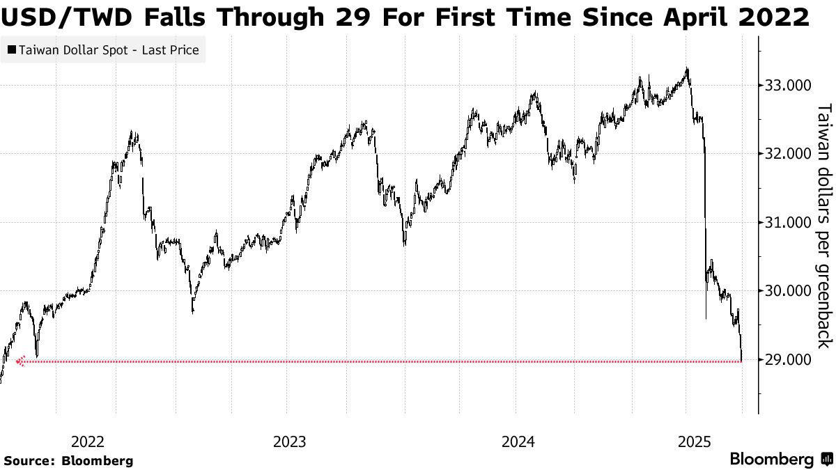 新台幣兑美元匯率突破29元大關 創2022年以來新高——彭博社